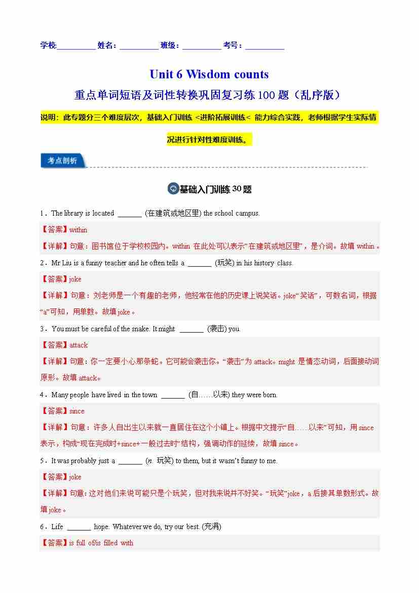 Unit 6 Wisdom counts 重点单词短语及词性转换巩固复习练100题(乱序版)(教师版)