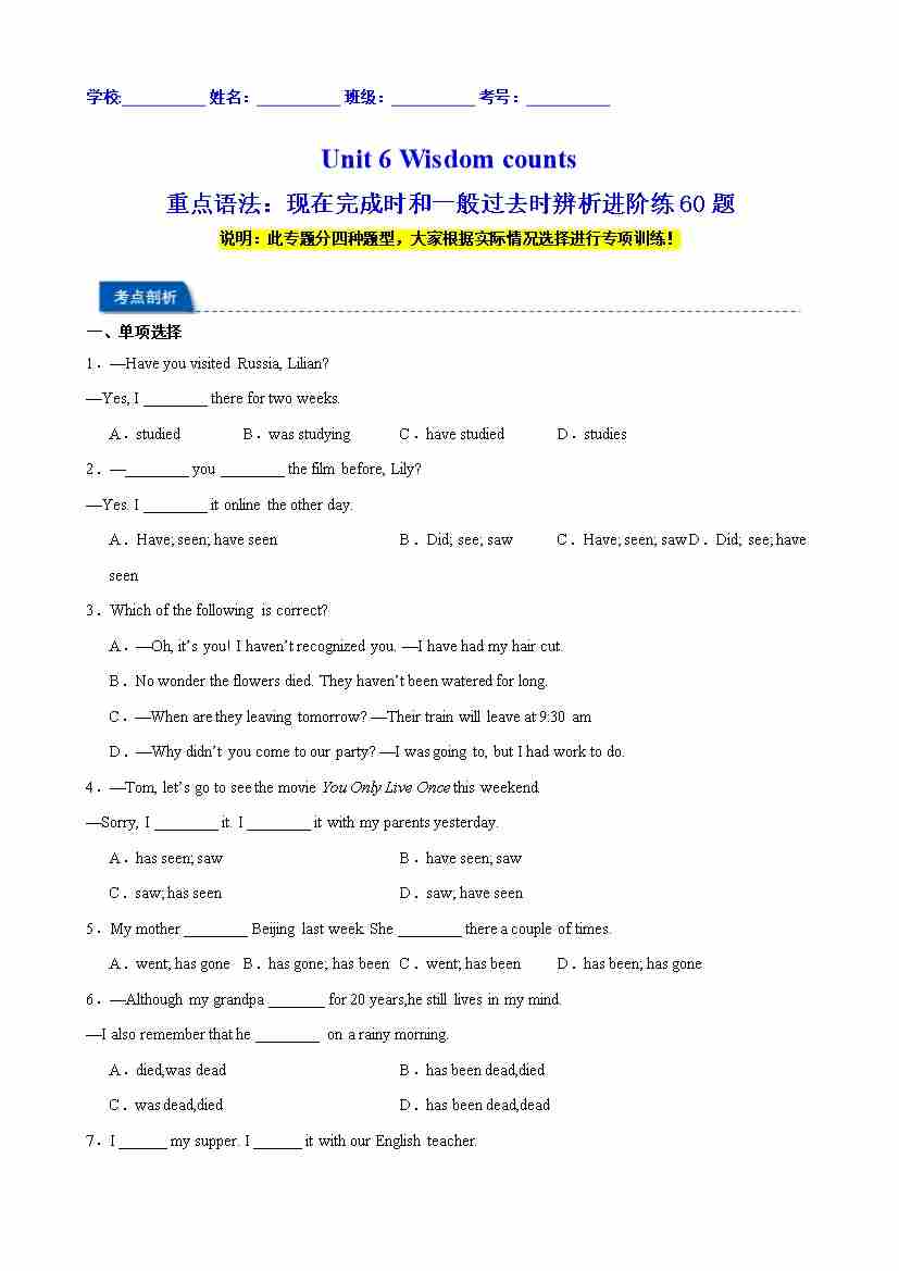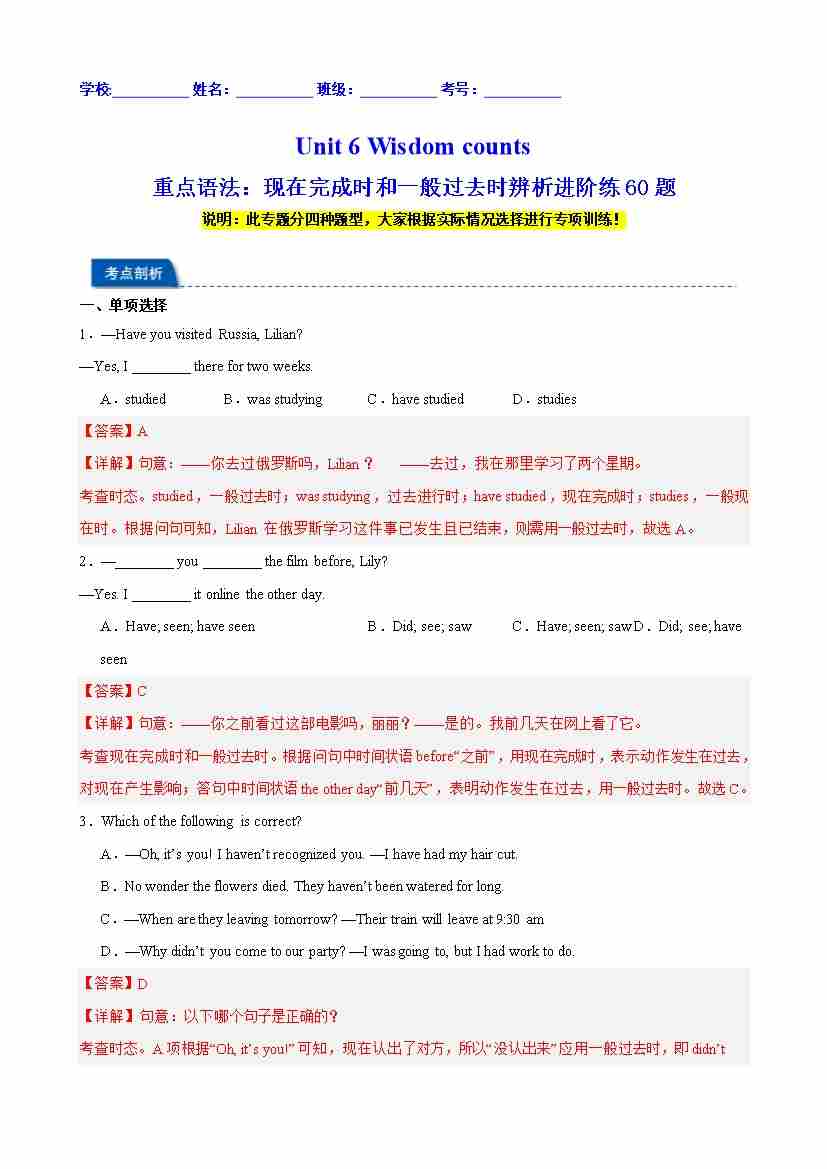 Unit 6 Wisdom counts 重点语法:现在完成时和一般过去时辨析进阶练60题(教师版)