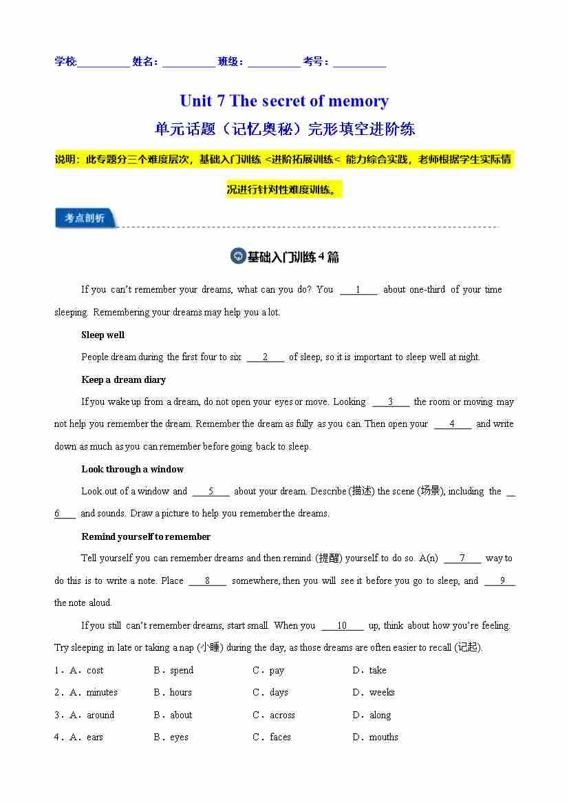 Unit 7 The secret of memory 单元话题(记忆奥秘)完形填空进阶练(教师版)