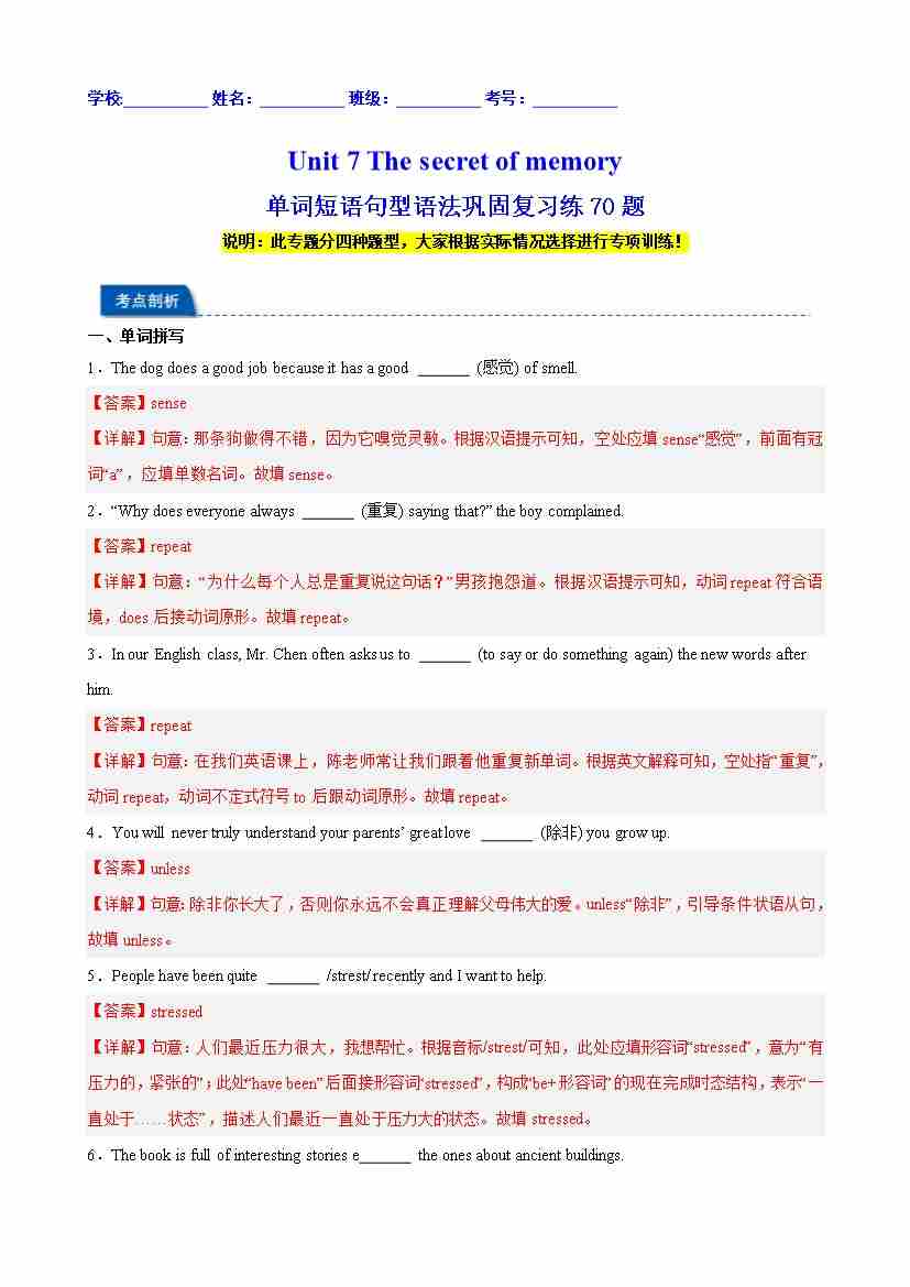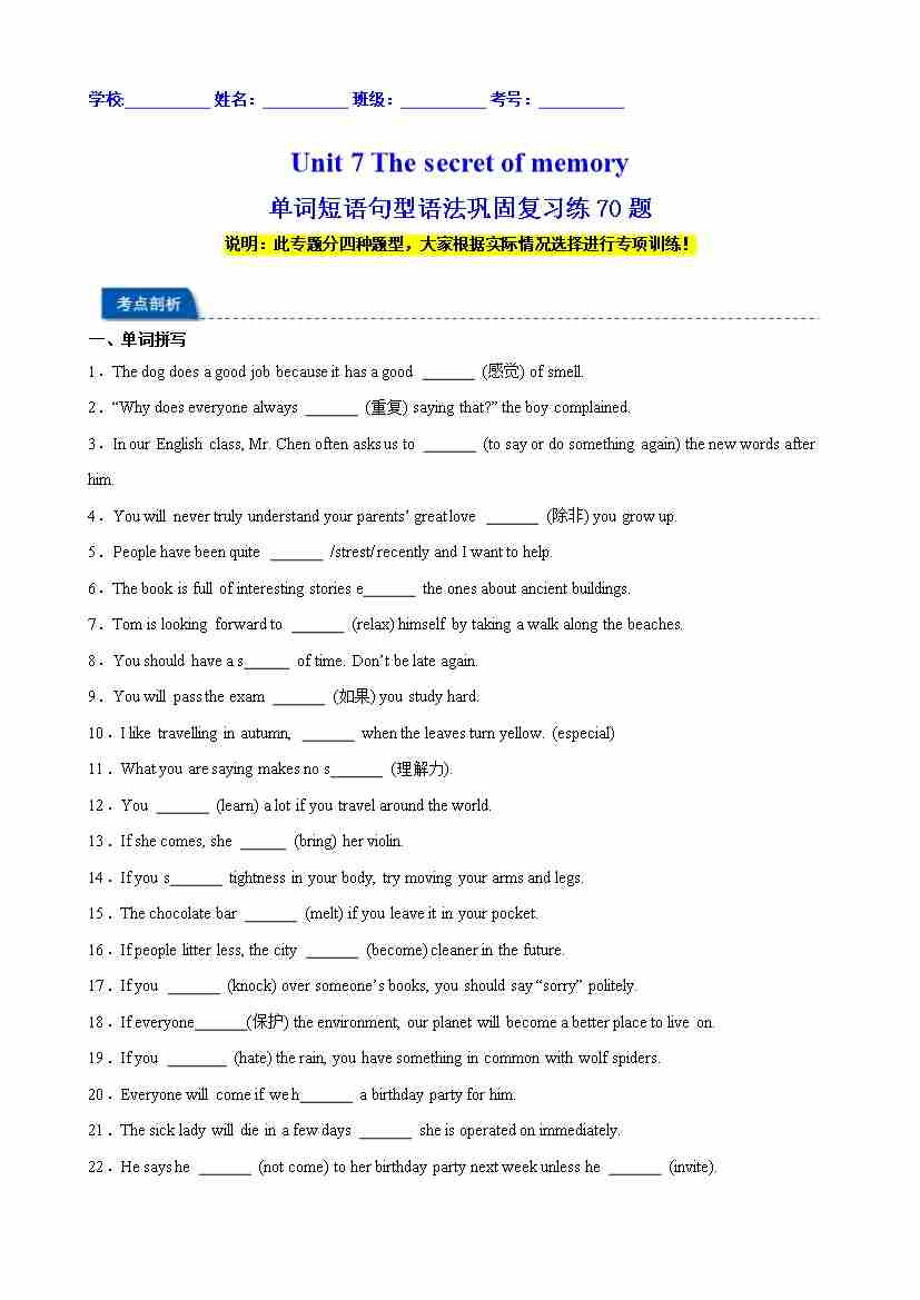 Unit 7 The secret of memory 单词短语句型语法巩固复习练70题(学生版)