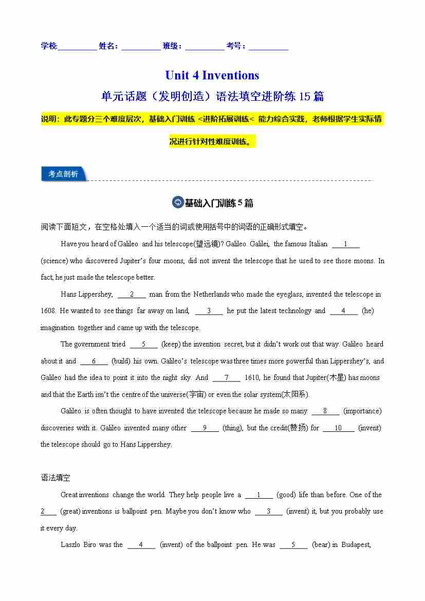 Unit 4 Inventions 单元话题(发明创造)语法填空进阶练15篇(学生版)