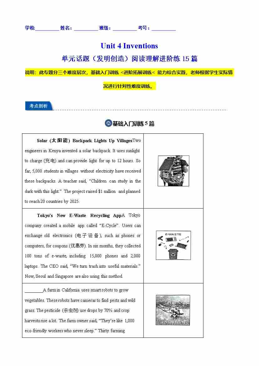 Unit 4 Inventions 单元话题(发明创造)阅读理解进阶练15篇(学生版)