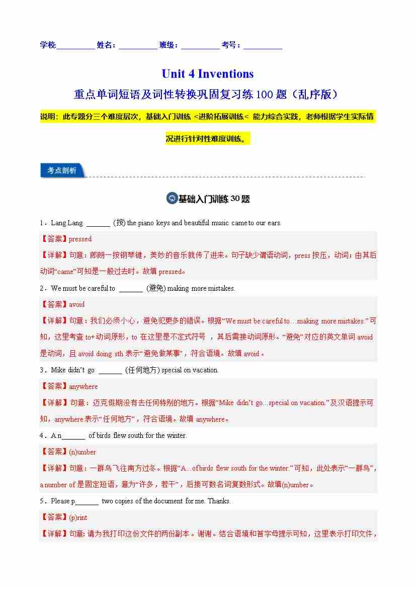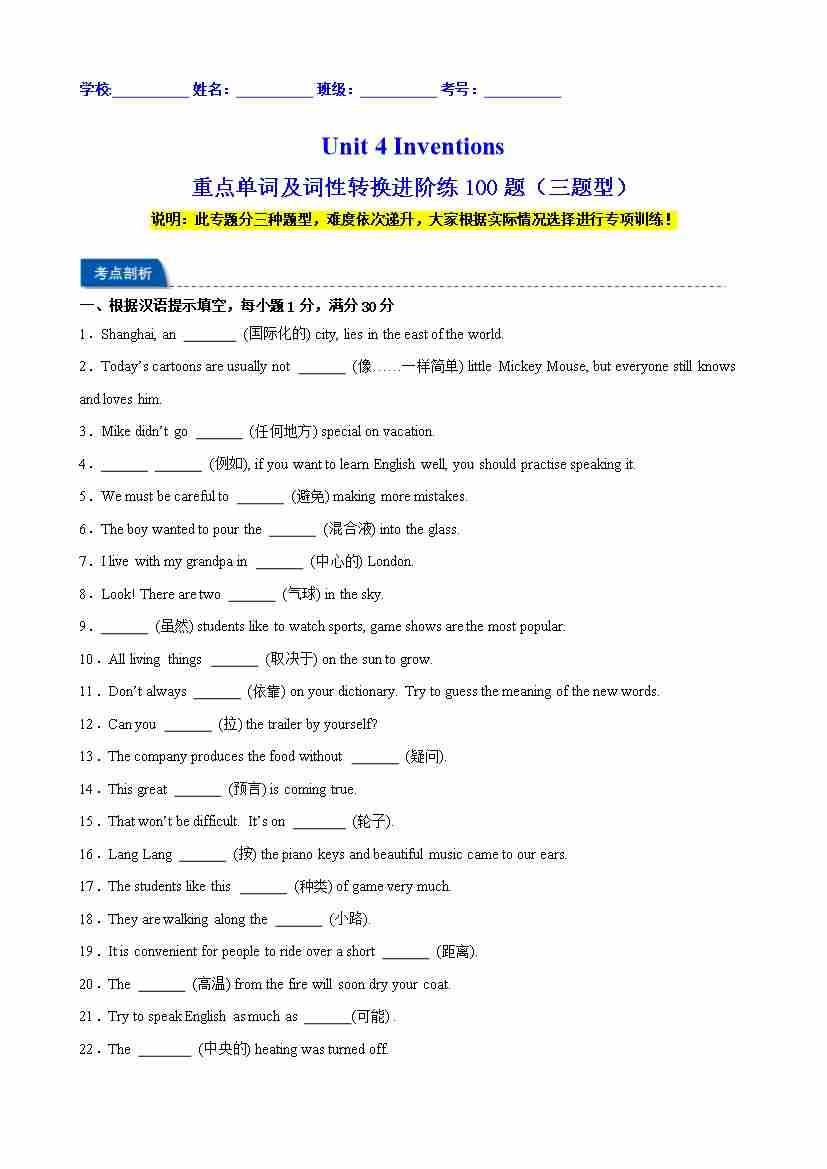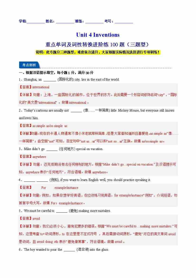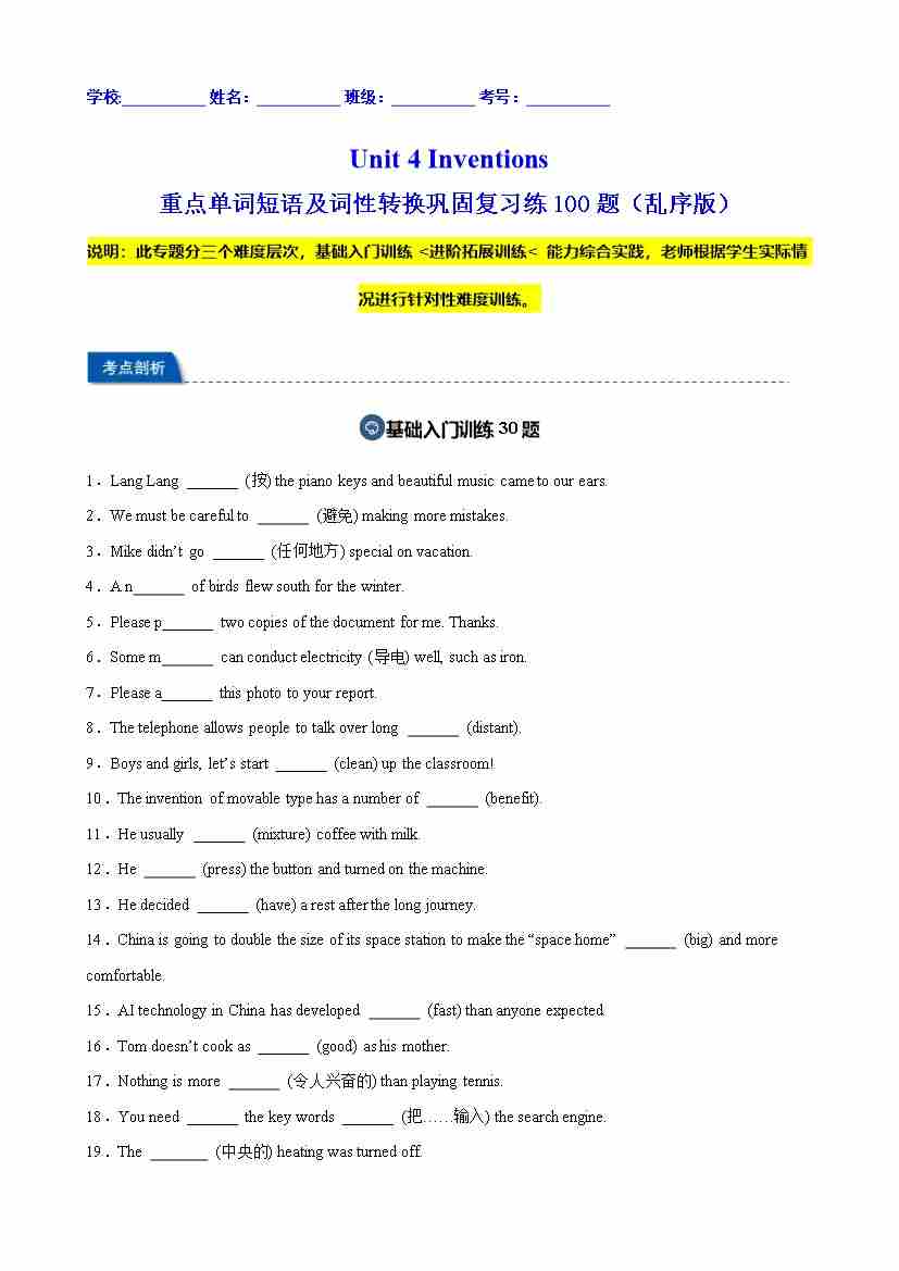 Unit 4 Inventions 重点单词及词性转换进阶练100题(三题型)(教师版)