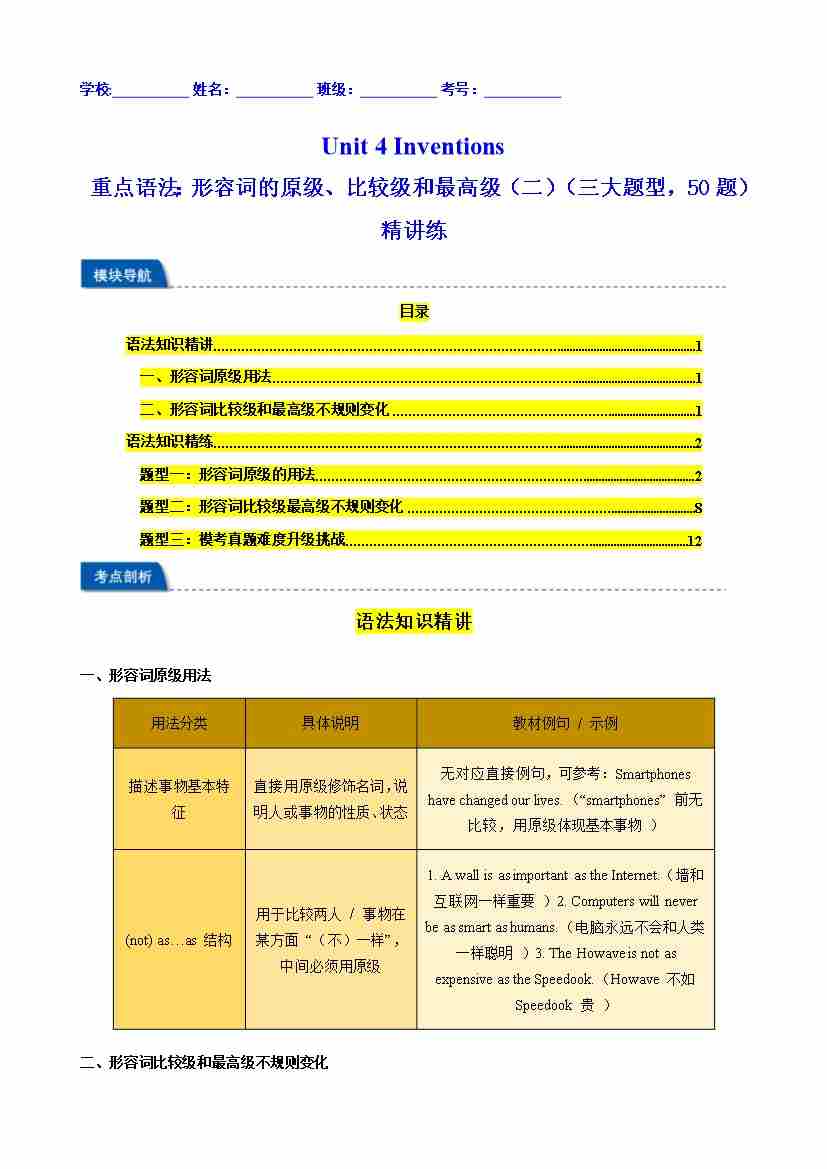 Unit 4 Inventions 重点语法:形容词的原级、比较级和最高级(二)(三大题型,50题)精讲练(学生版)