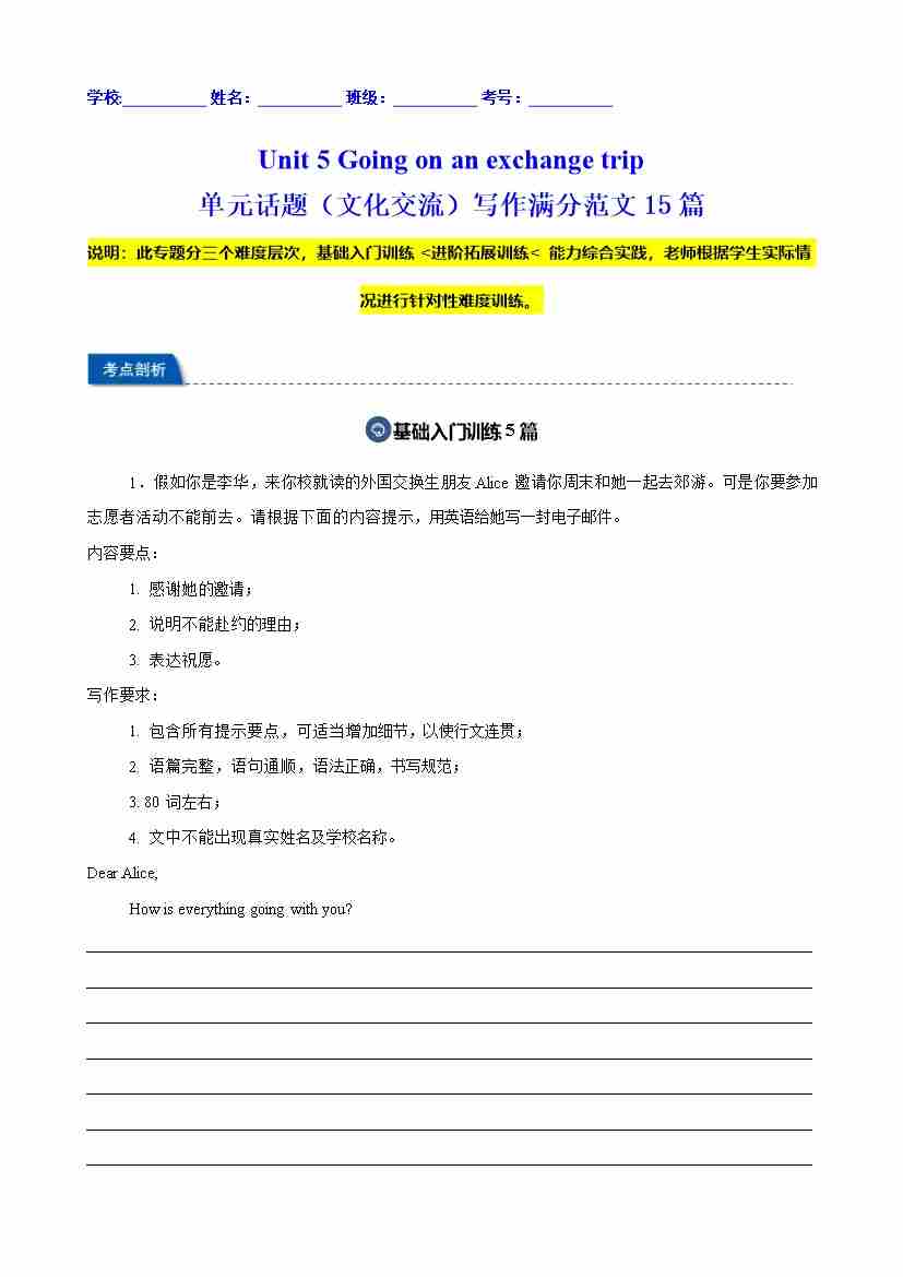 Unit 5 Going on an exchange trip 单元话题(文化交流)写作满分范文15篇(教师版)