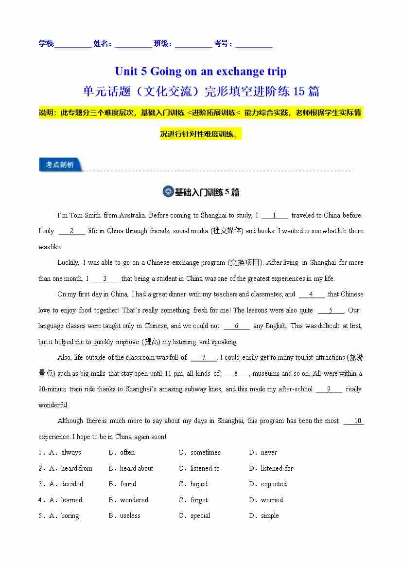Unit 5 Going on an exchange trip 单元话题(文化交流)完形填空进阶练15篇(学生版)