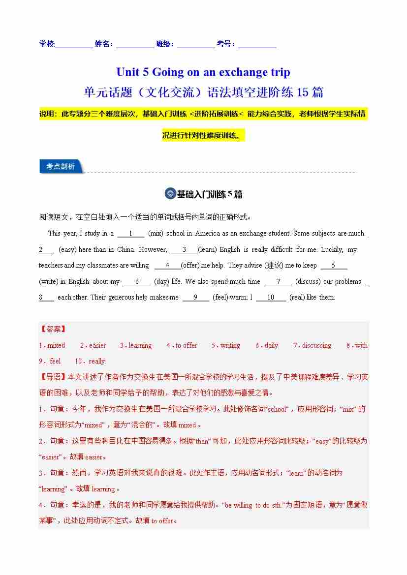 Unit 5 Going on an exchange trip 单元话题(文化交流)语法填空进阶练15篇(教师版)