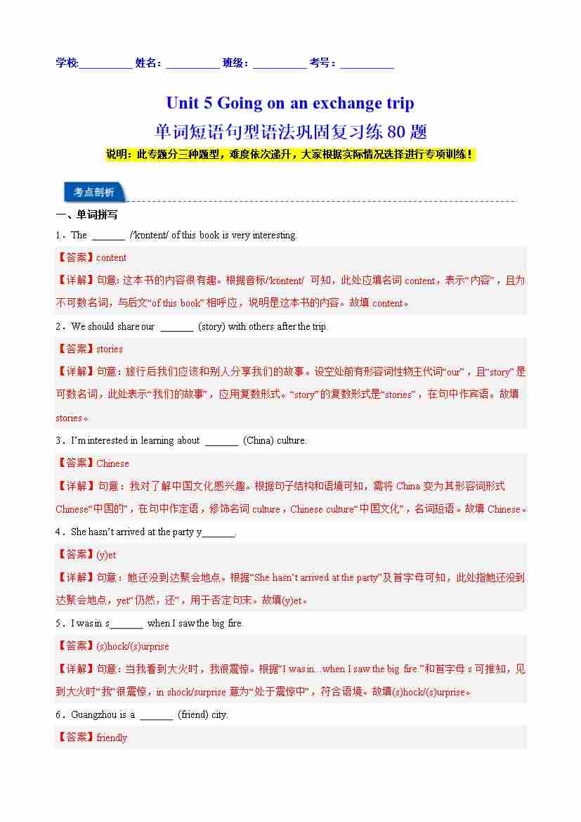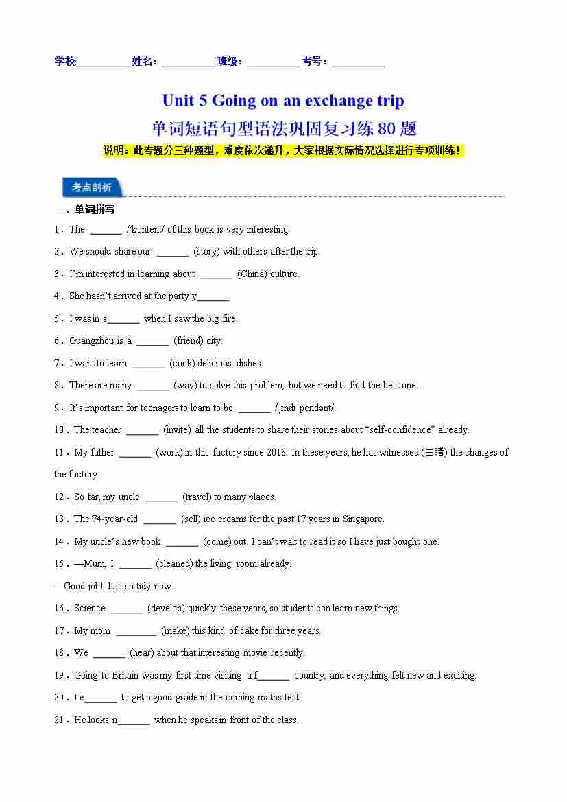 Unit 5 Going on an exchange trip 单词短语句型语法巩固复习练80题(教师版)