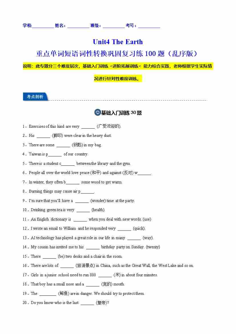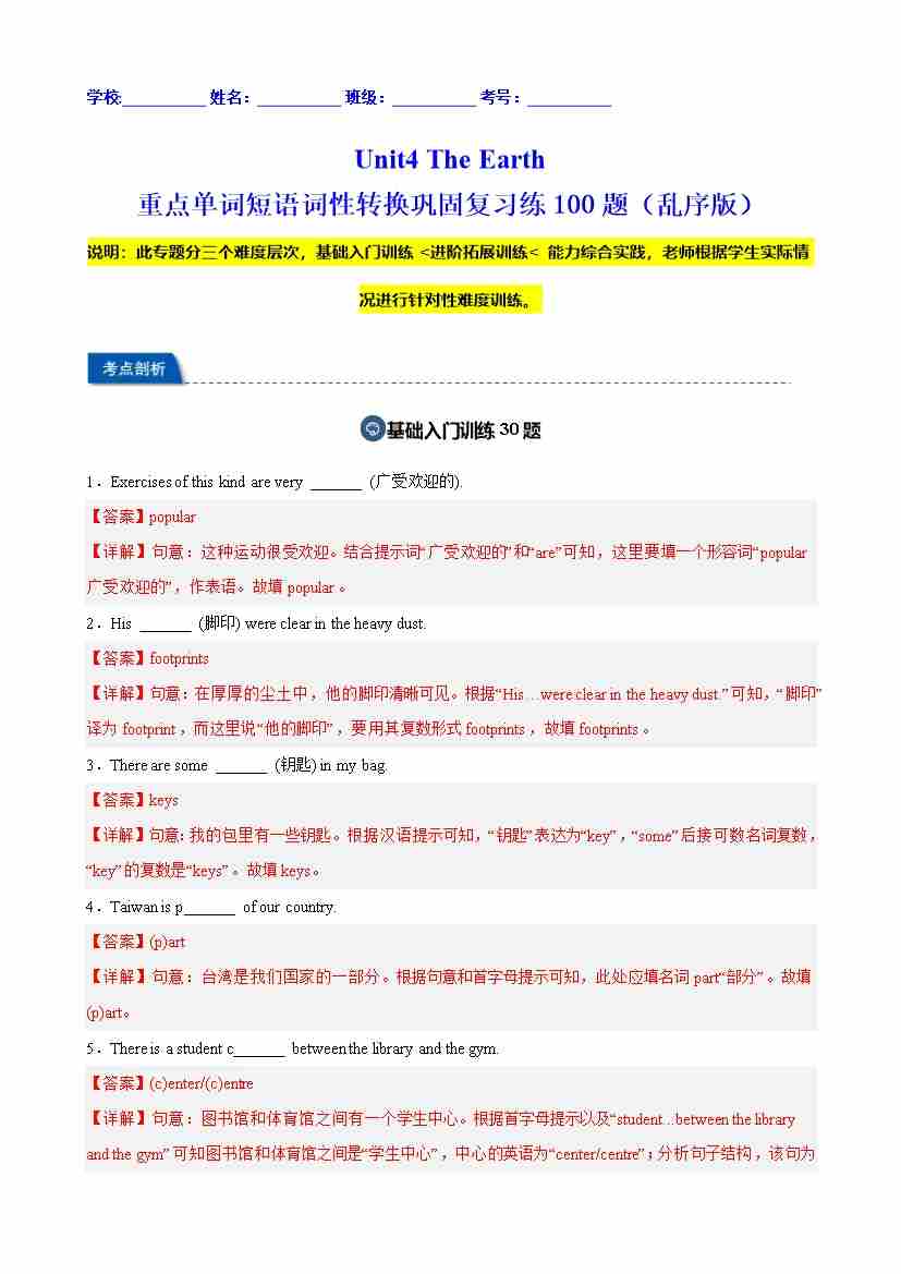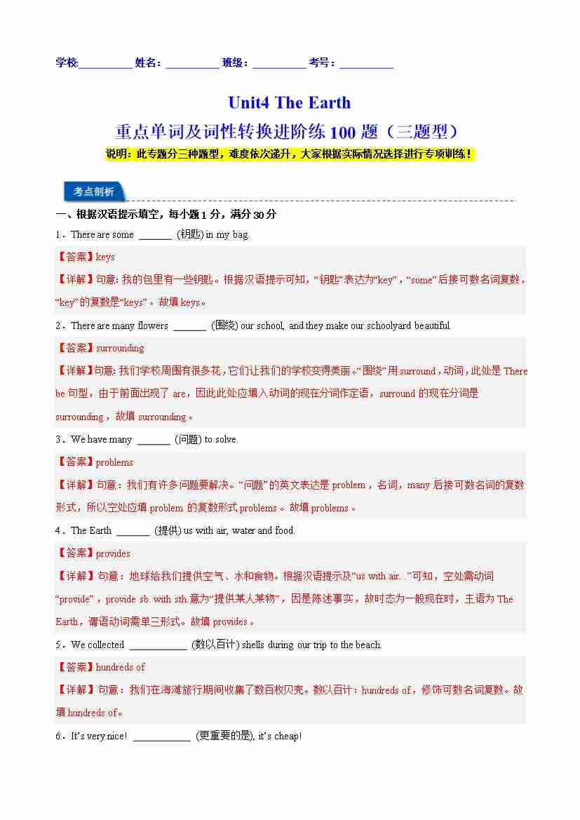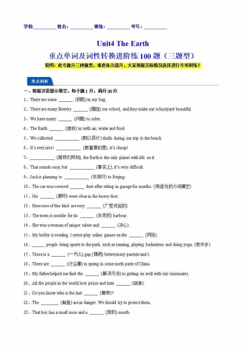 Unit4 The Earth 重点单词及词性转换进阶练100题(三题型)(教师版)