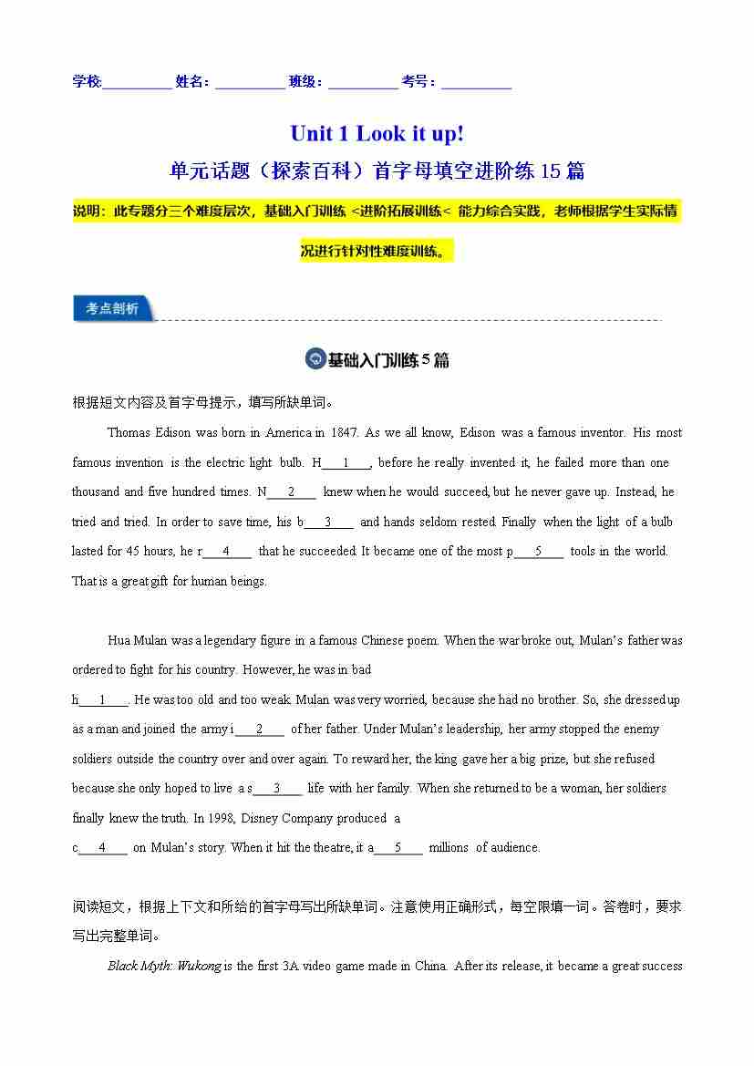 Unit 1 Look it up! 单元话题(探索百科)首字母填空进阶练15篇(学生版)
