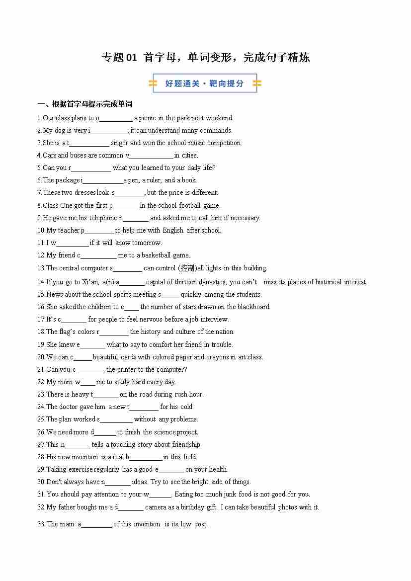考前押题01 首字母,单词变形,完成句子精练(期末复习专项训练)(原卷版)