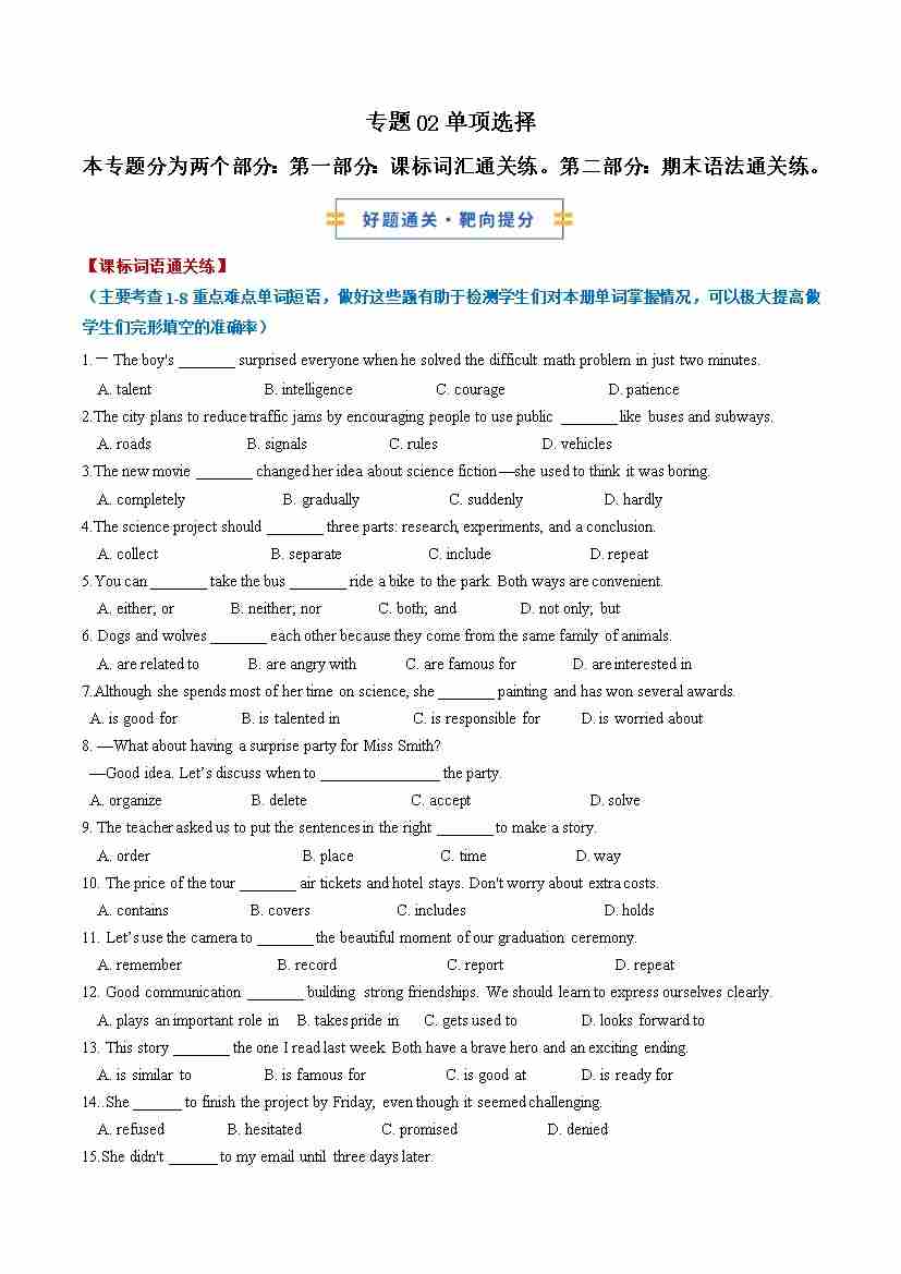 考前押题02 单项选择 (期末复习专项训练)(原卷版)