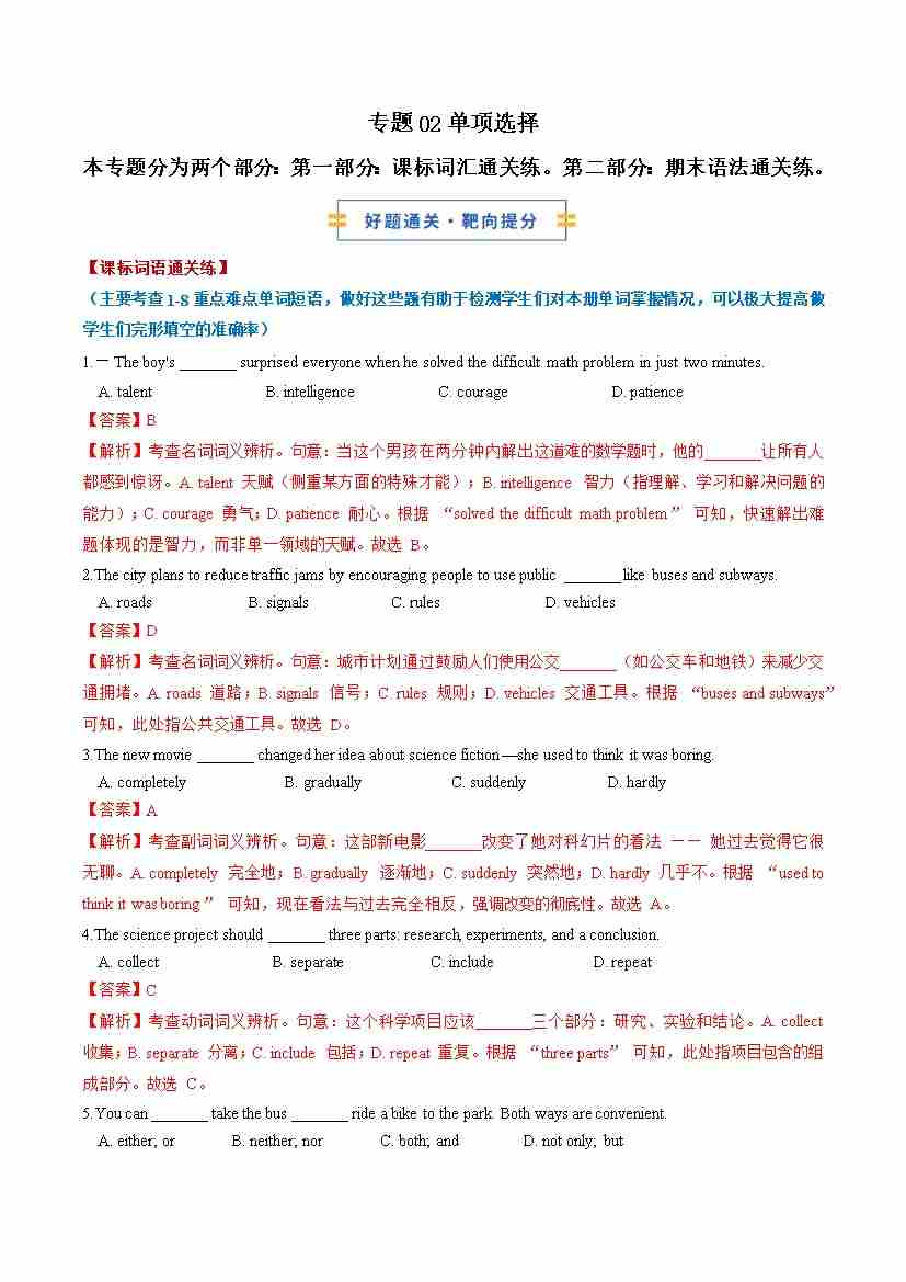考前押题02 单项选择 (期末复习专项训练)(解析版)