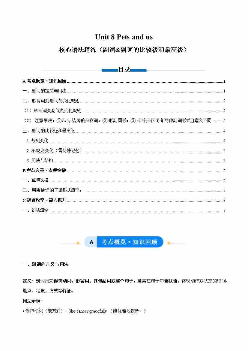 Unit 8 Pets and us 副词及副词的比较级和最高级(单元核心语法精练)(学生版)