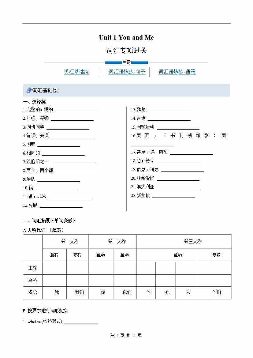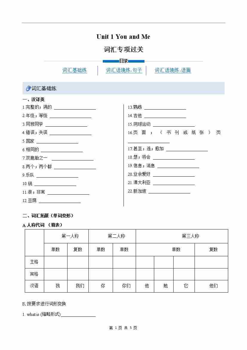 Unit 1 You and me(重难词汇精练)(原卷版)