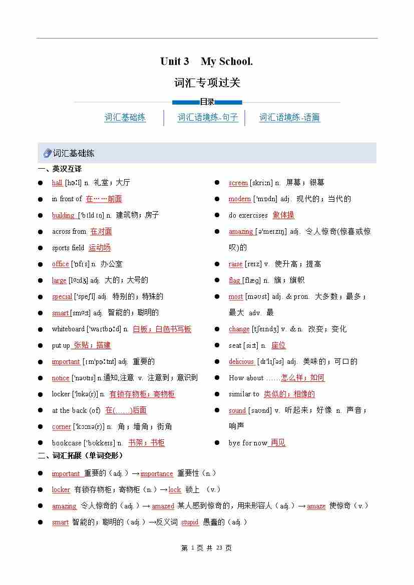 Unit 3 My School(重难词汇精练)(解析版)
