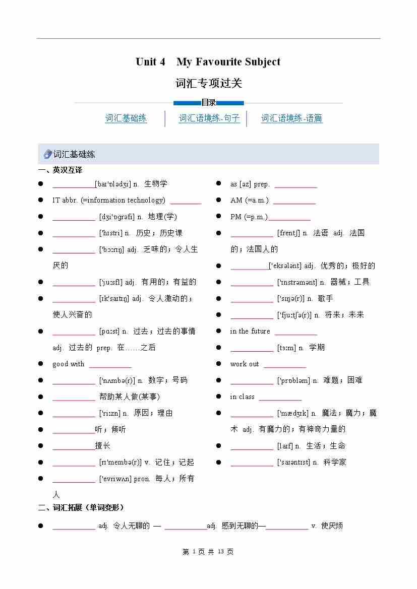 Unit 4 My Favourite Subject(重难词汇精练)(原卷版)