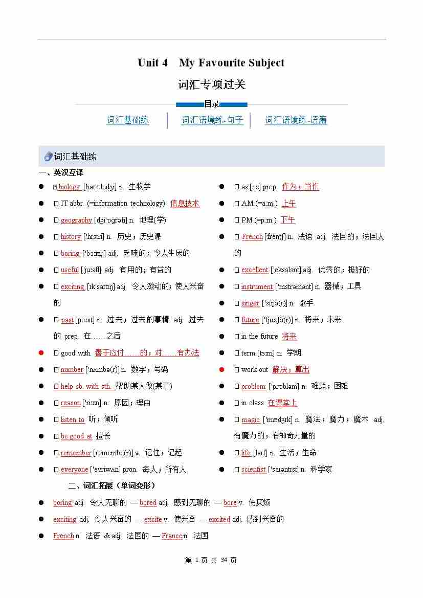 Unit 4 My Favourite Subject(重难词汇精练)(解析版)