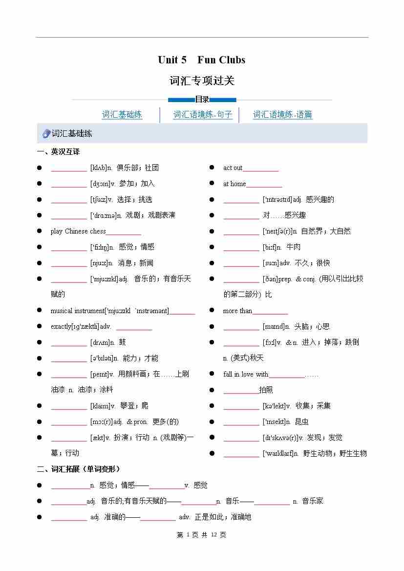Unit 5 Fun Clubs(重难词汇精练)(原卷版)