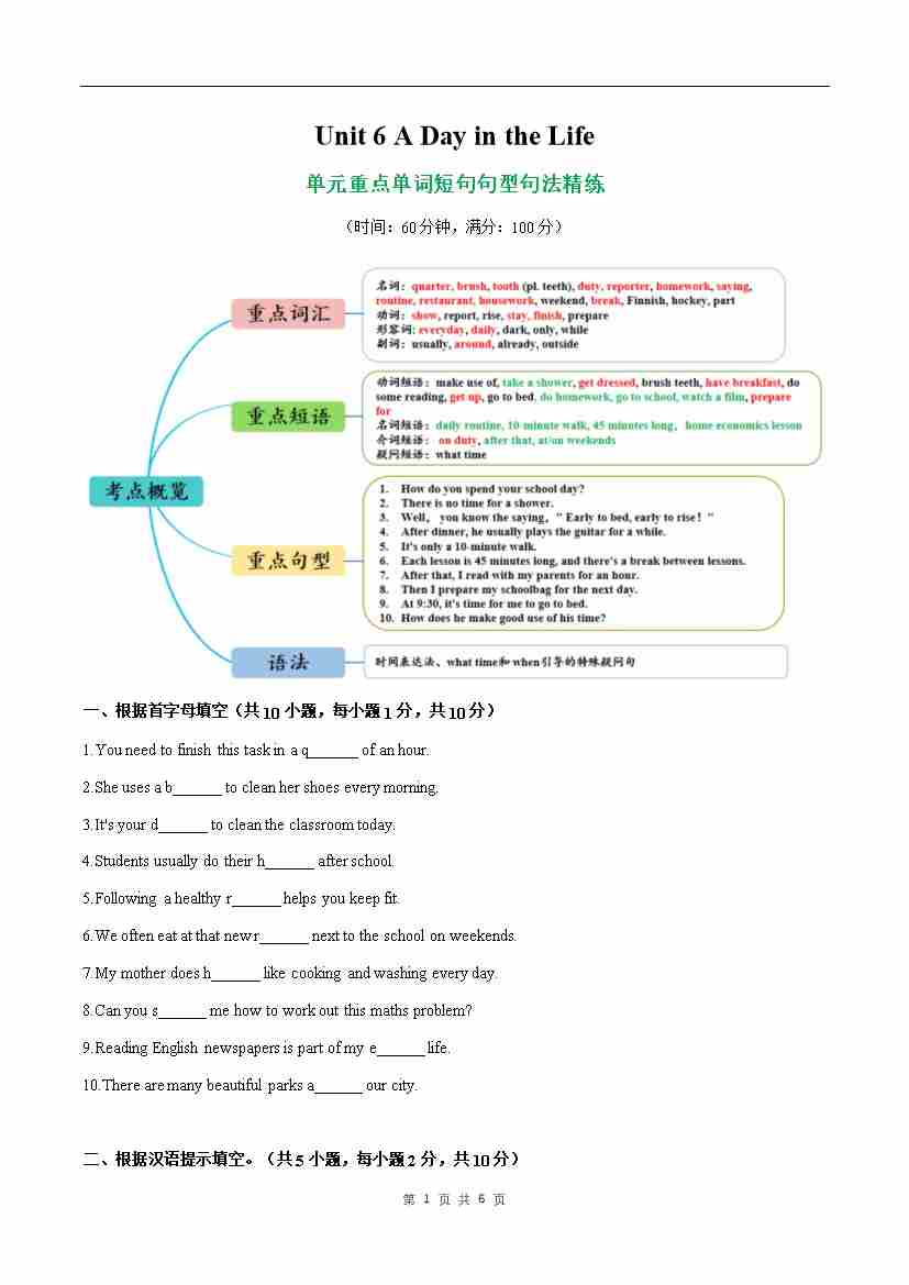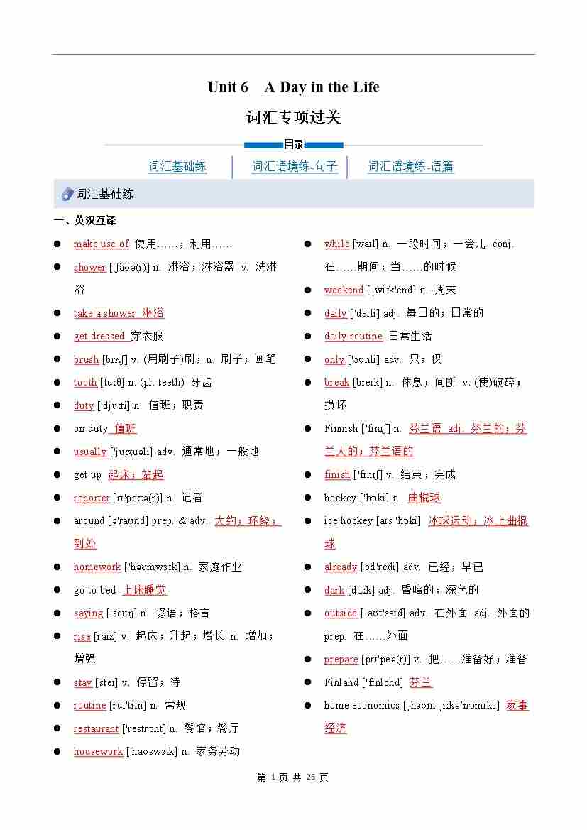 Unit 6 A Day in the Life 单词短语句型语法(教材考点精练)(原卷版)