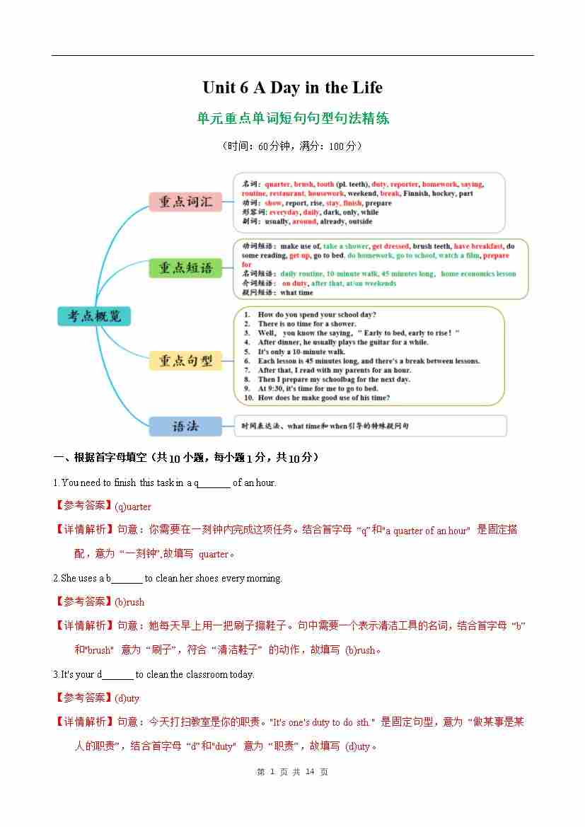 Unit 6 A Day in the Life 单词短语句型语法(教材考点精练)(解析版)
