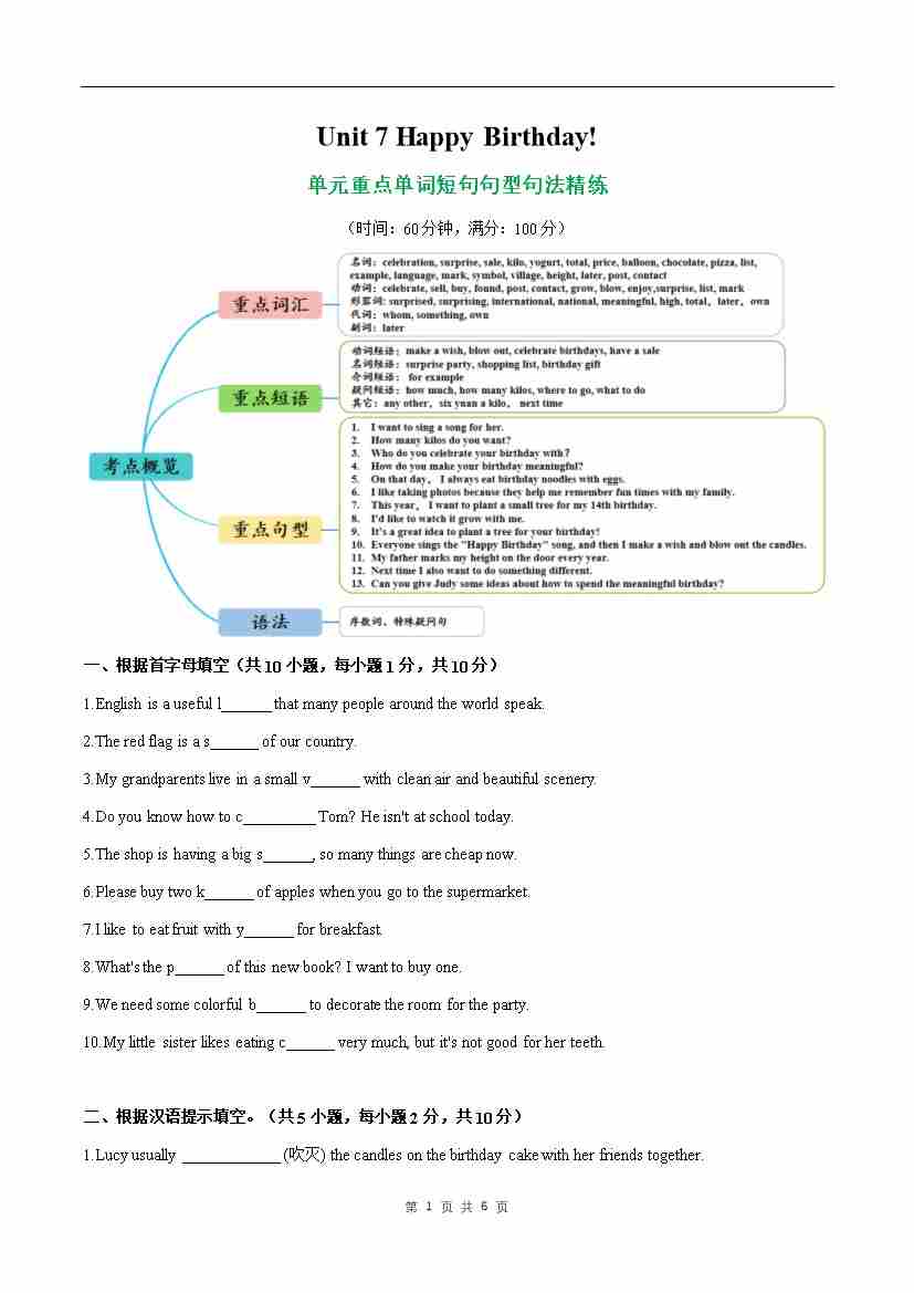 Unit 7 Happy Birthday! 单词短语句型语法(教材考点精练)(原卷版)