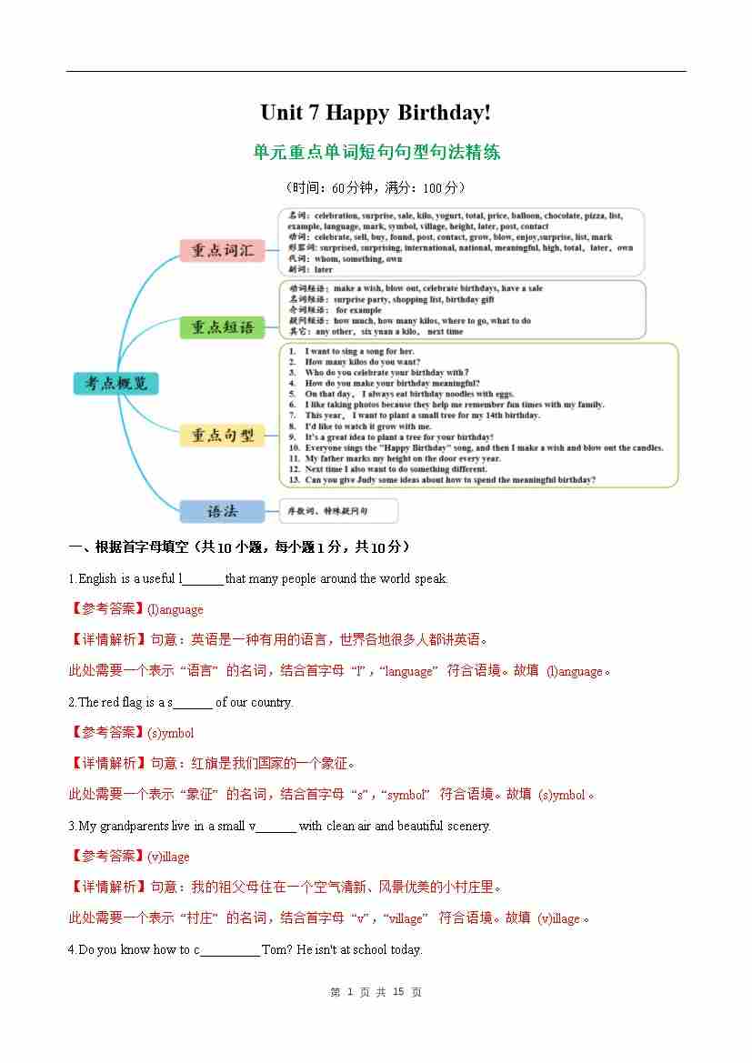 Unit 7 Happy Birthday! 单词短语句型语法(教材考点精练)(解析版)