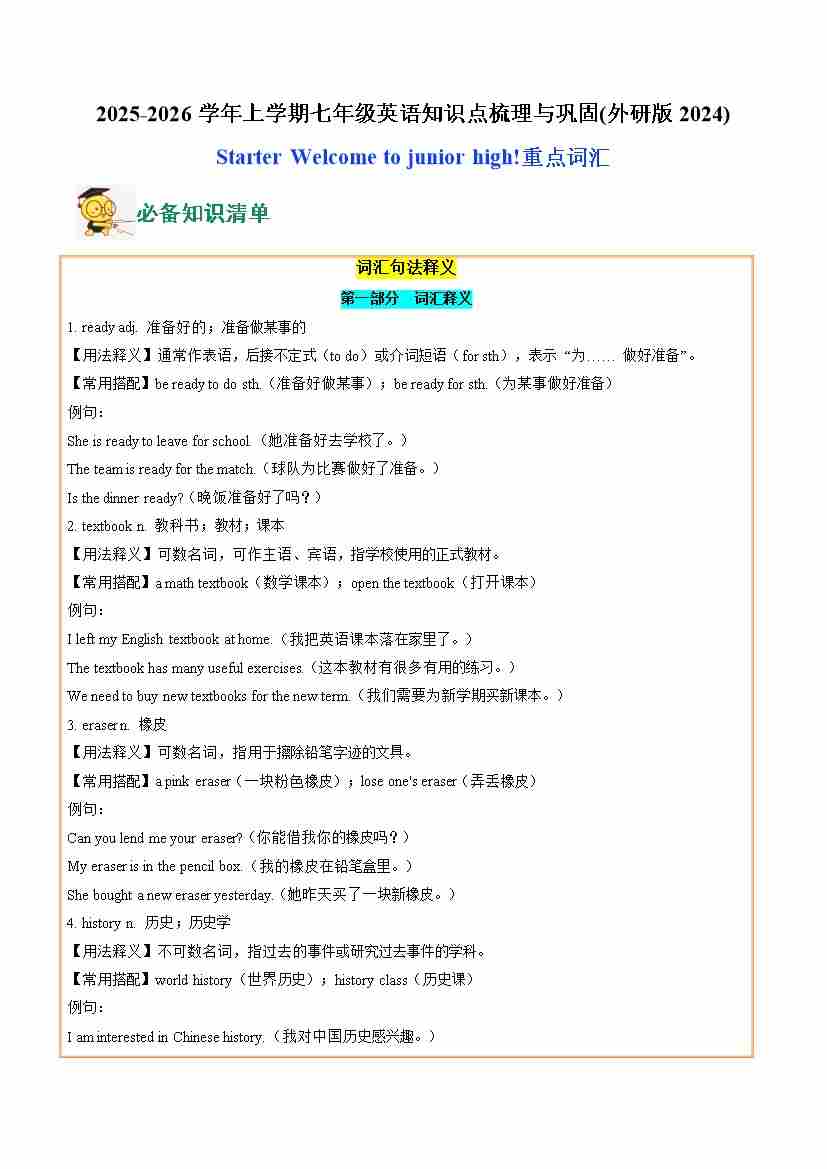 01.Starter Welcome to junior high!(重点词汇)(教师版)