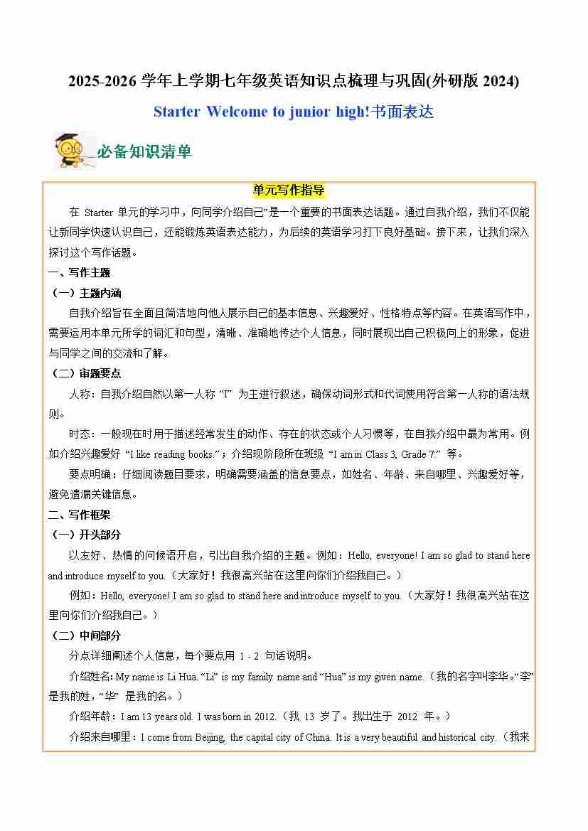 03.Starter Welcome to junior high! (书面表达)(学生版)