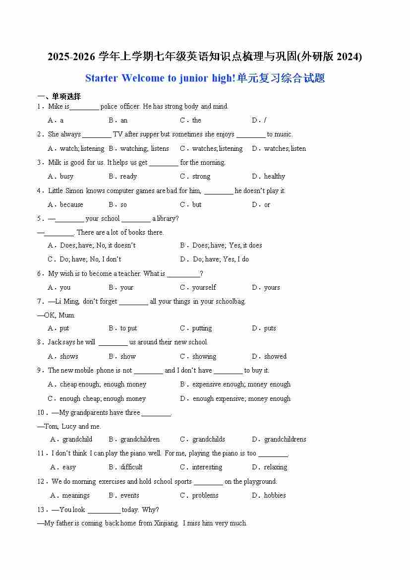 05.Starter Welcome to junior high!(综合练习)(学生版)
