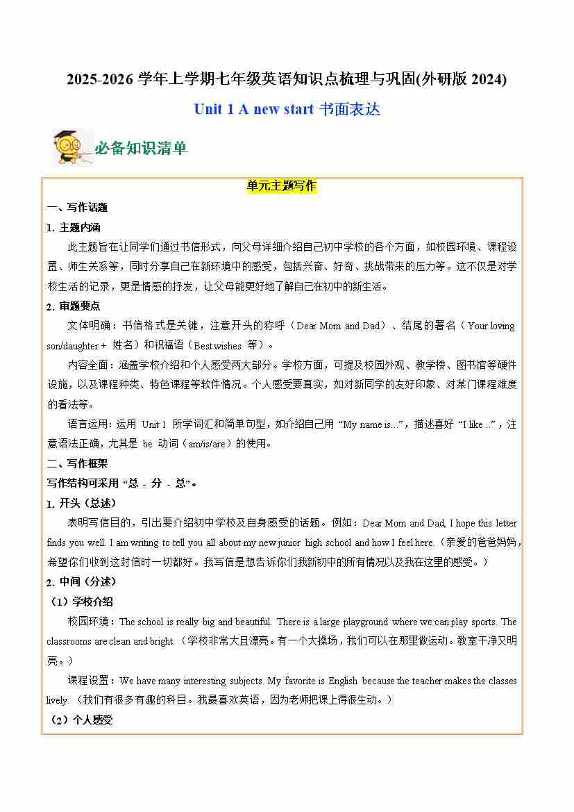 08.Unit 1 A new start (书面表达)(学生版)