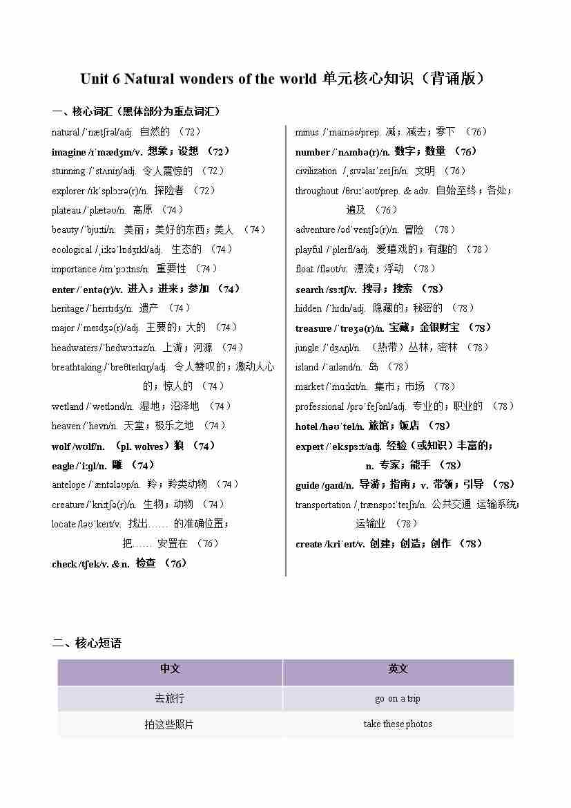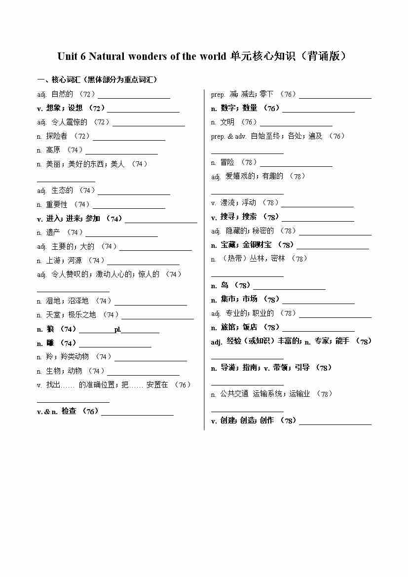 Unit 6 Natural wonders of the world(单元核心知识)(默写版)
