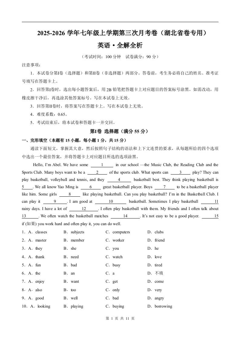 七年级英语第三次月考卷(全解全析)(湖北省卷专用)