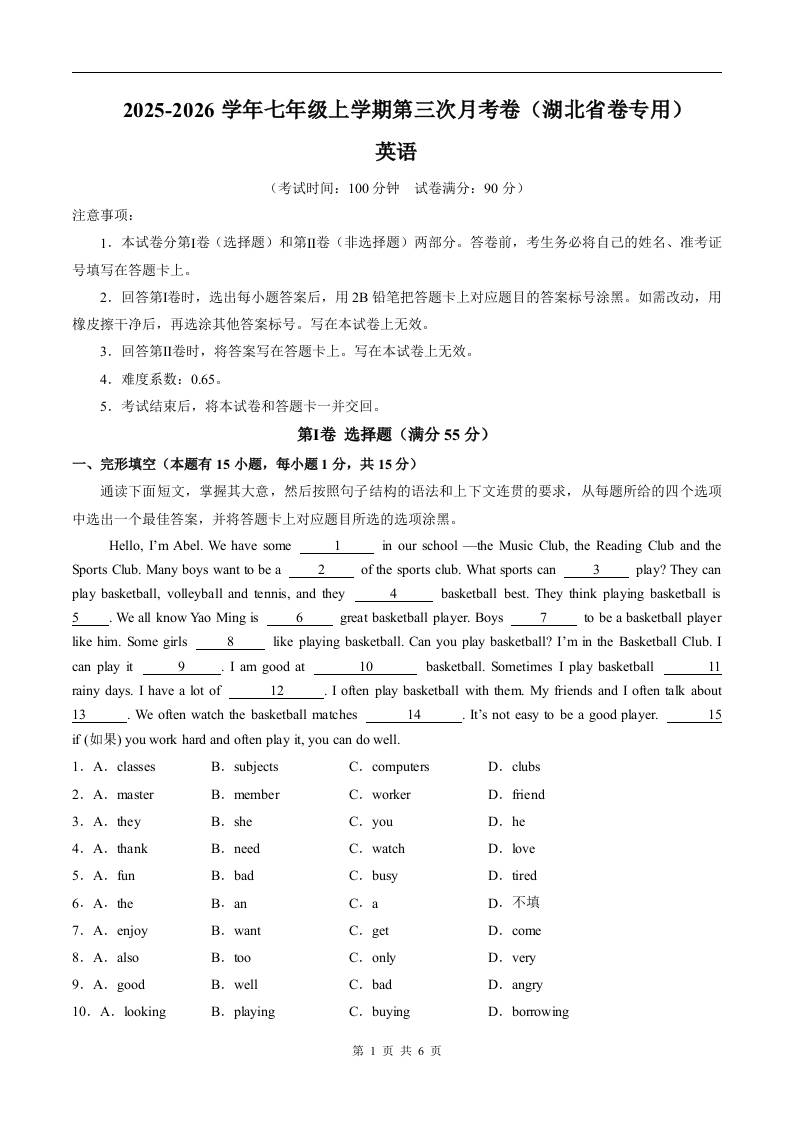 七年级英语第三次月考卷(考试版A4)(湖北省卷专用)