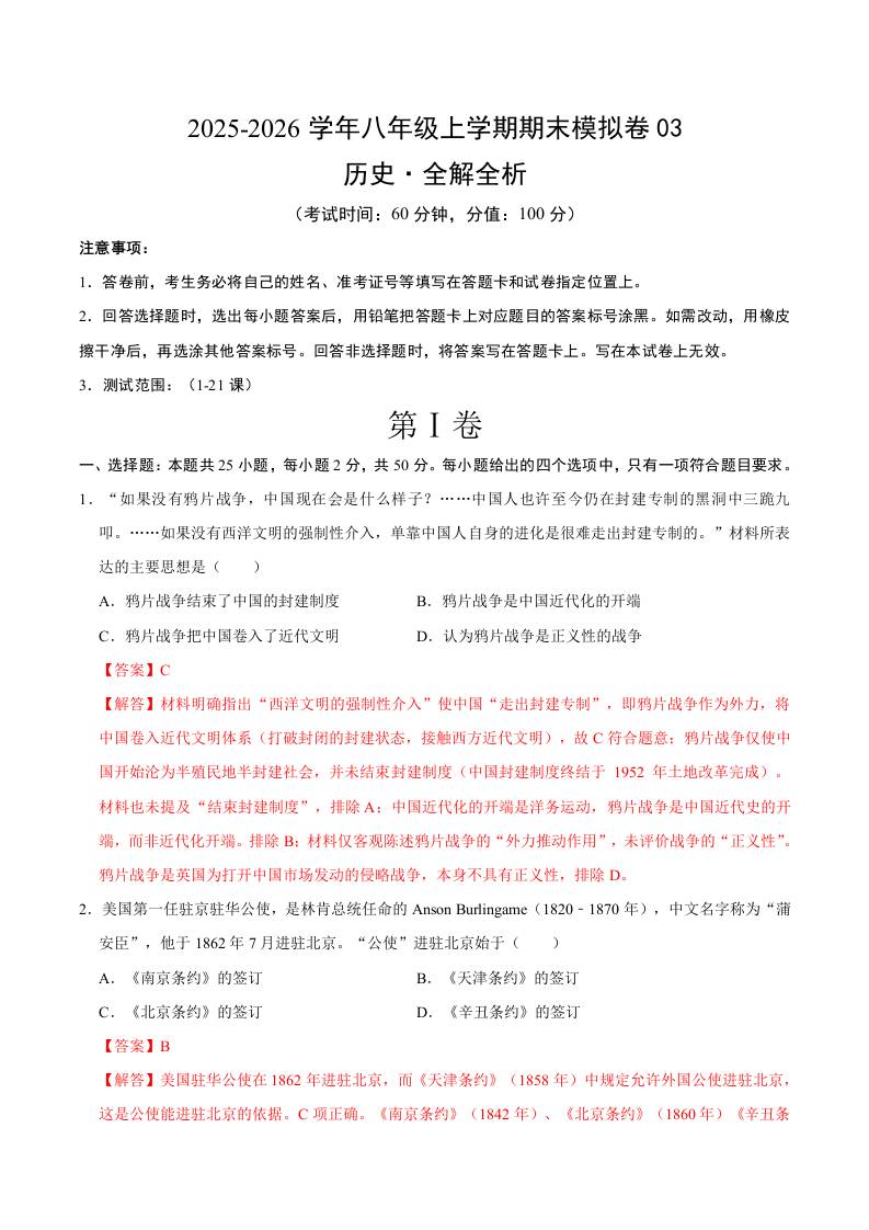 八年级历史上学期期末模拟卷03(新教材统编版)(全解全析)88