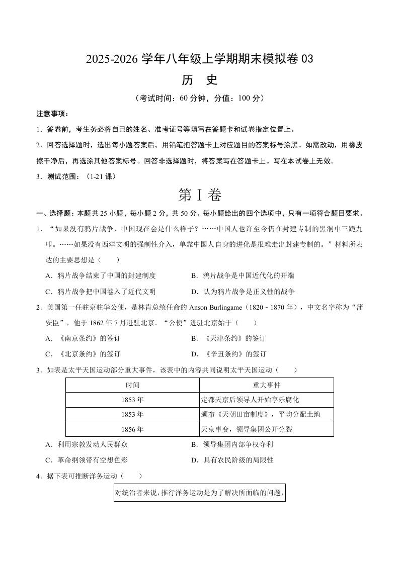 八年级历史上学期期末模拟卷03(新教材统编版)(考试版)33