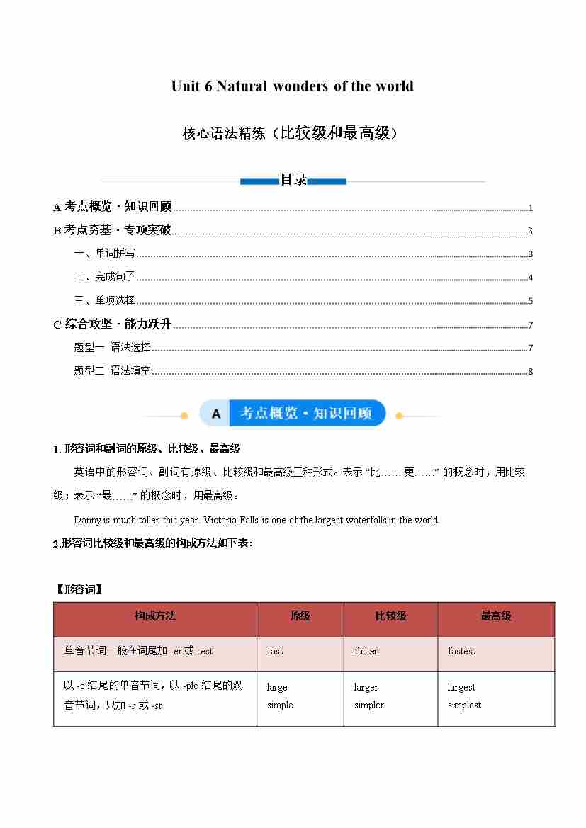 Unit 6 Natural wonders of the world 比较级和最高级(单元核心语法精练)(原卷版)