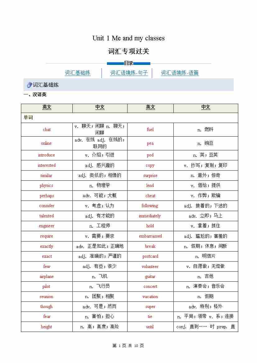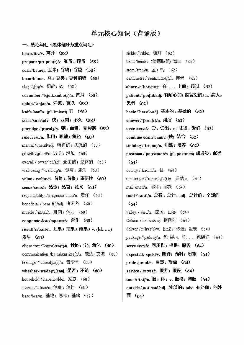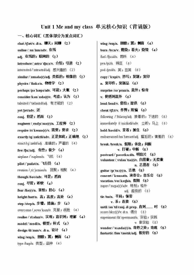 Unit 1 Me and my class(单元核心知识)(背诵版)