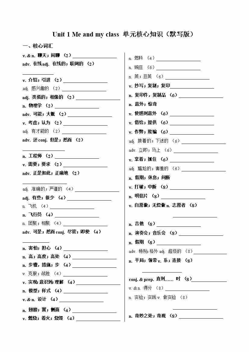 Unit 1 Me and my class(单元核心知识)(默写版)