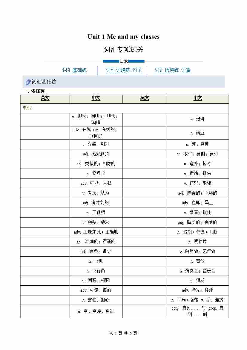 Unit 1 Me and my class(重难词汇精炼)(原卷版)八上冀教