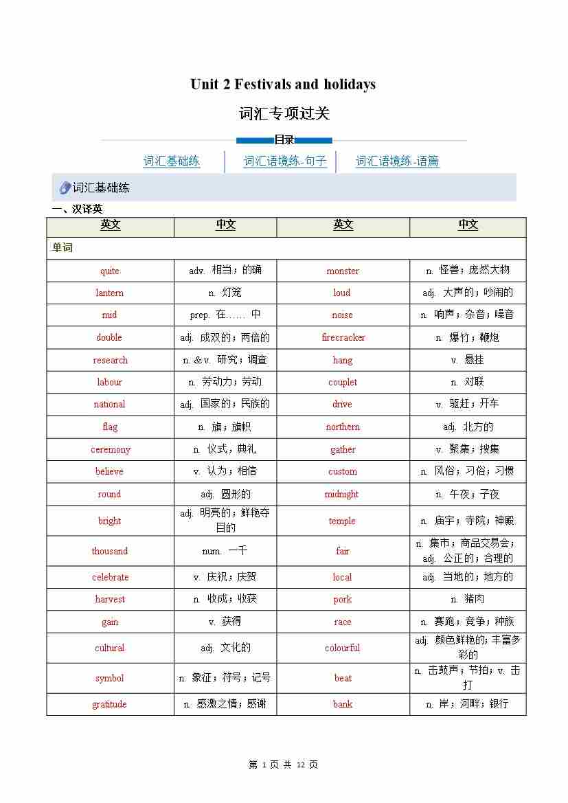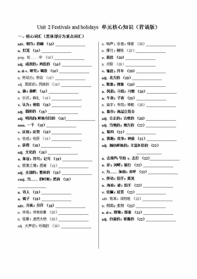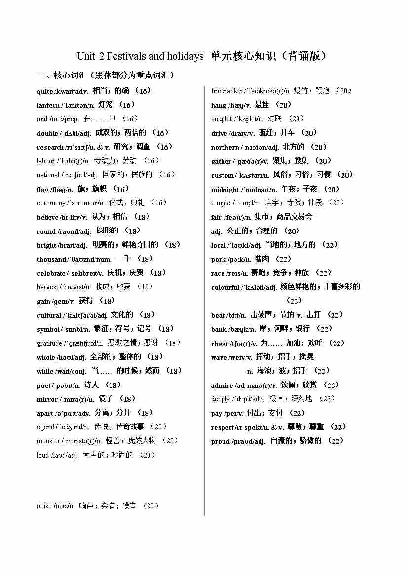 Unit 2 Festivals and holidays(单元核心知识)(默写版)