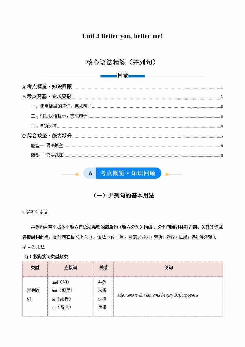 Unit 3 Better you, better me! 并列句(单元核心语法精练)(原卷版)