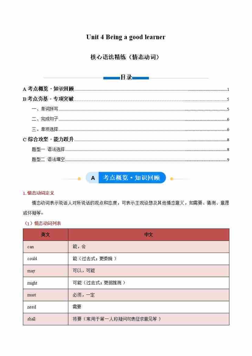 Unit 4 Being a good learner 情态动词(单元核心语法精练)(解析版)