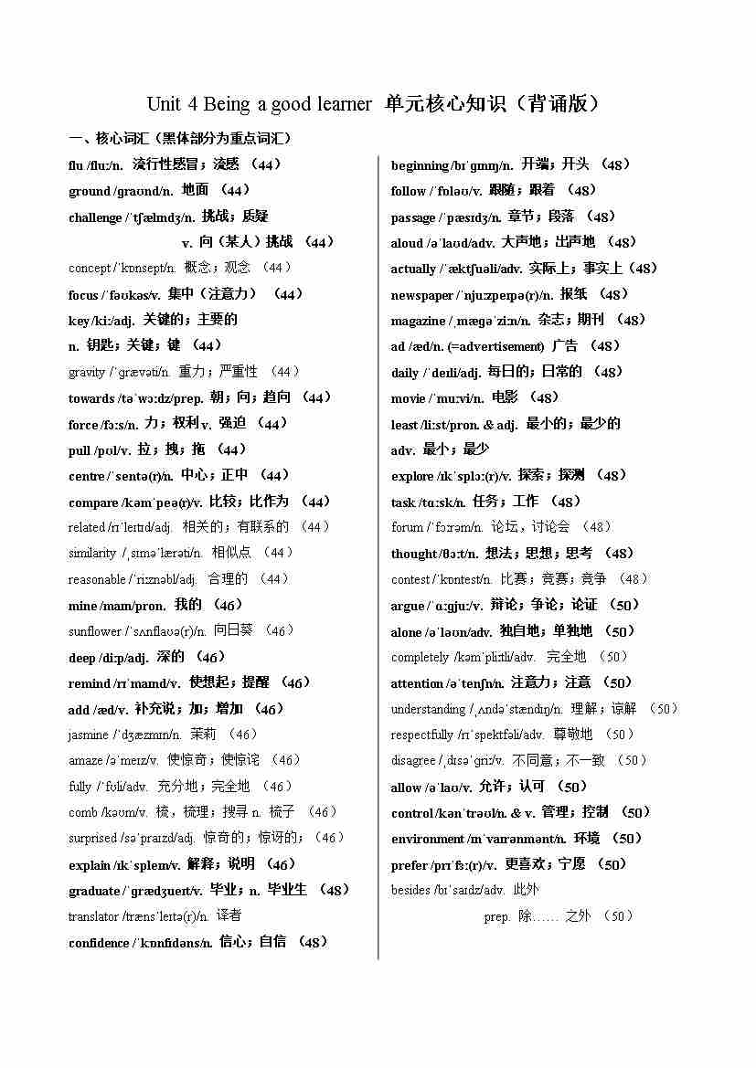 Unit 4 Being a good learner(单元核心知识)(背诵版)