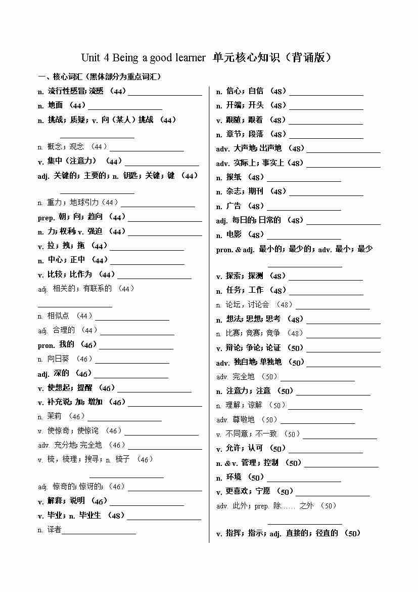 Unit 4 Being a good learner(单元核心知识)(默写版)