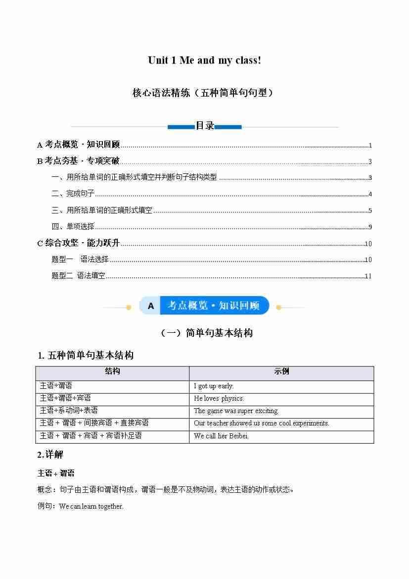 Unit 1 Me and my class!五种简单句结构(单元核心语法精练)(解析版)