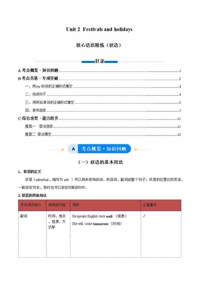 Unit 2 Festivals and holidays 状语(单元核心语法精练)(原卷版)