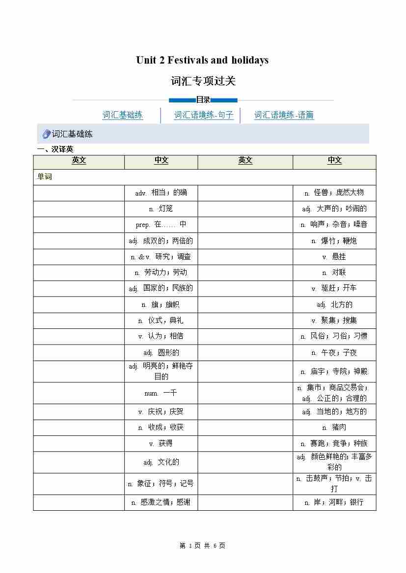 Unit 2 Festivals and holidays(重难词汇精炼)(原卷版)八上冀教