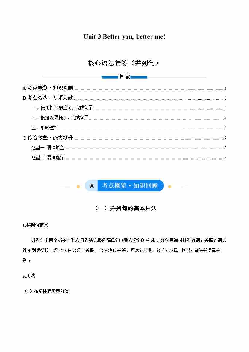 Unit 3 Better you, better me! 并列句 (单元核心语法精练)(解析版)