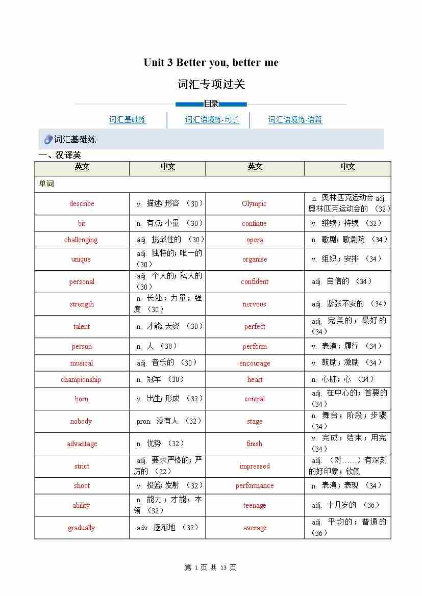 Unit 3 Better you, better me(重难词汇精炼)(解析版)八上冀教